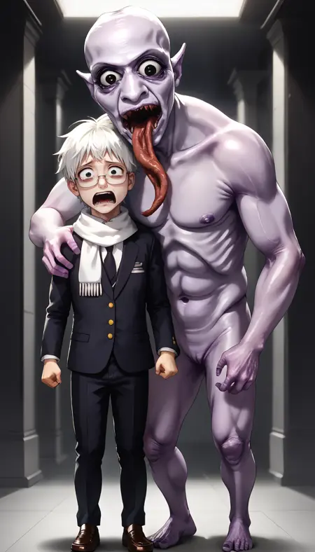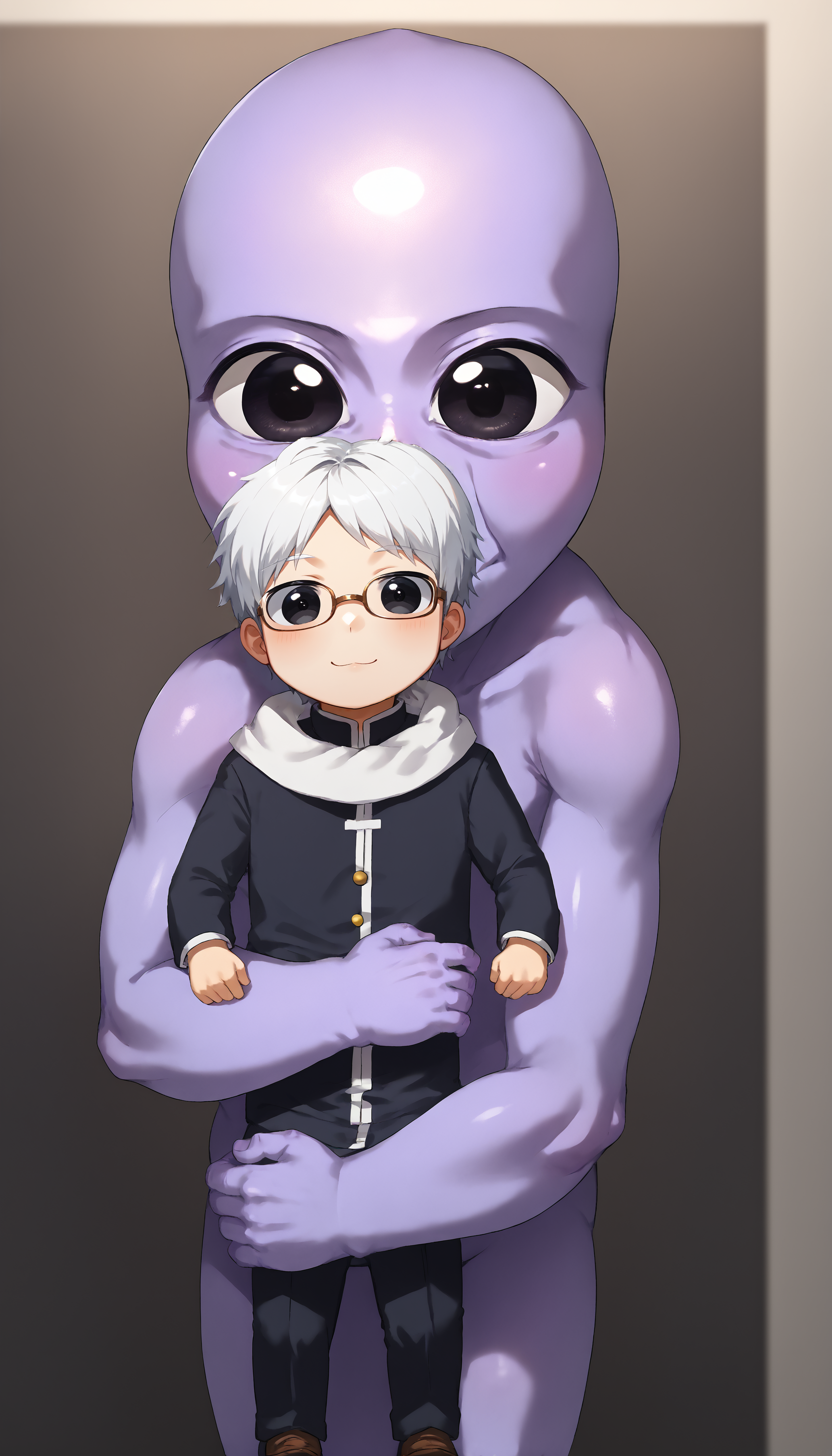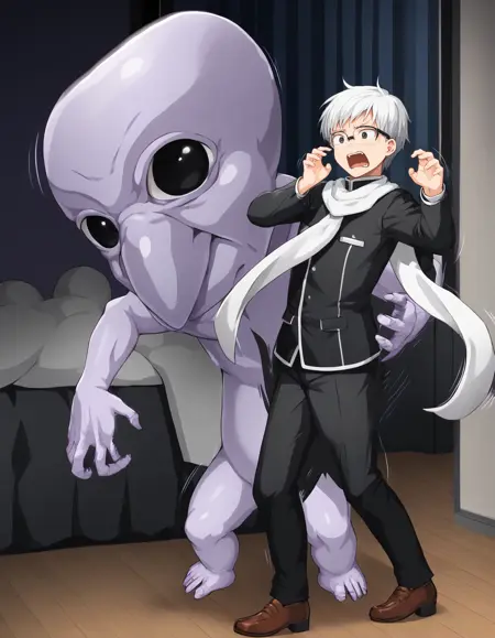 Use these triggers for Hiroshi: Hiroshi, male foocus, white hair, glasses, black school uniform, white scarf, black eyes, bangs, black outfit, brown shoes (PONY) (ILLUSTRION)
