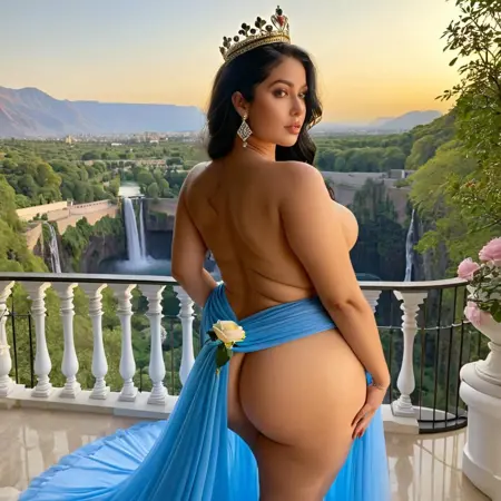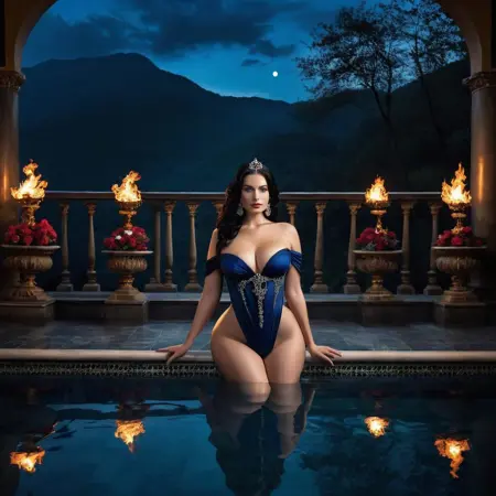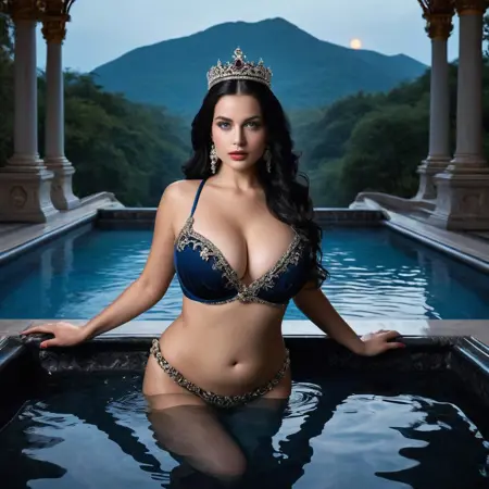 自然な設定の中に、曲線美のある女性が静かで芸術的な姿で描かれている。彼女は冠をかぶり、黒い髪が肩へ優雅に流れている。美しい青い目をした彼女は、透き通るドレスを着て、大きな王室のベッドに裸で横たわっている。