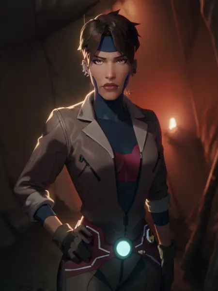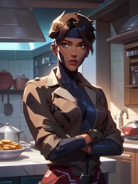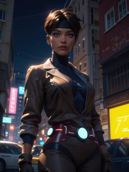 Rocket, 1girl, dark-skinned female, short hair, brown eyes, headband, piercing, earring, bodysuit, jacket, belt, boots, gloves