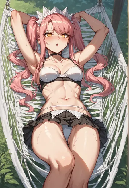 夏日克诺克: 长发,粉发,黄眼,花环,黑色比基尼,分离式长袜