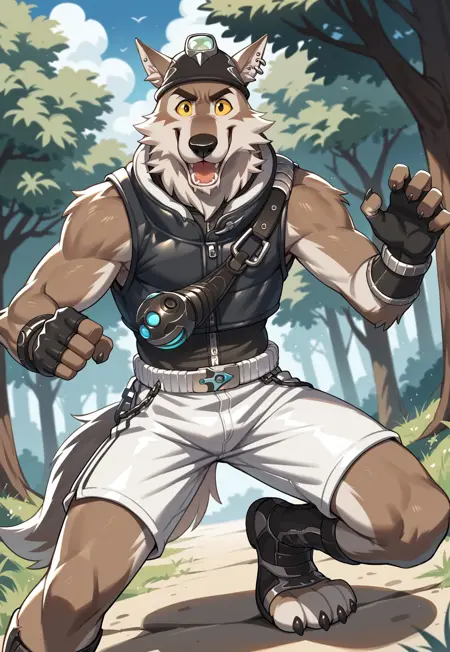 Wendell, Wolf, Brown Fur, Hat, Right-Ear-Piercing, Shoulder-Gear, Black Jacket, Shorts, Fingerless Gloves, Footwear
