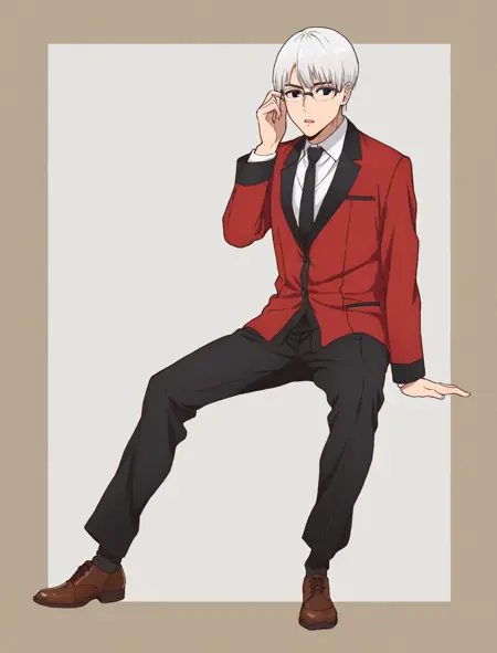red jacket, necktie, white shirt, black pants