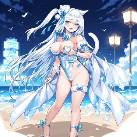 - dobrynya, white hair, long hair, large breasts, blue eyes, animal ears, tail, cat ears, cat tail, cat girl,