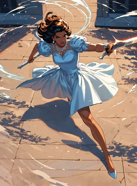 이 모델은 다양한 스타일의 혼합체로, 주로 골드, 실버, 브론즈 시대의 고전 만화 스타일과 현대적인 해석을 융합했습니다. 이 모델은 색상을 사랑하며, 색상에 생명을 얻습니다. 따라서 “생동감 있는 색상” 같은 표현을 사용하면 장면이 훨씬 더 살아납니다. 이 모델은 캐릭터에 매우 단순한 서양식 외관을 제공하며, 다소 오래된 느낌을 줄 수 있습니다. 하지만 동시에 시간을 초월한 느낌이 있죠(저는 모순된 말을 하고 있습니다). 이 모델은 많은 예술가들이 그리기 위해 배운 이상적인 뼈대를 가지고 있으며, 실제로 제 예술 학교 시절을 떠올리게 합니다. 즉, 정말 정말 정말 어마어마하게 아름다운 사람들입니다. 이 외형과 뼈대는 사진 리얼리즘 모델을 사용할 때조차 사진에도 그대로 반영됩니다. 이 모델은 고전적인 헤어스타일과 의상도 그대로 반영합니다. 또한 매우 복잡하고 생동감 있는 배경과 함께 흐르는 움직임 장면을 잘 연출할 수 있습니다. 유일한 단점은 캐릭터의 얼굴이 멀어질수록 왜곡이 심해진다는 점입니다. 심지어 adetailer도 때때로 놓치지만, 필요하다면 얼굴을 inpaint로 수정할 수 있습니다.