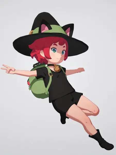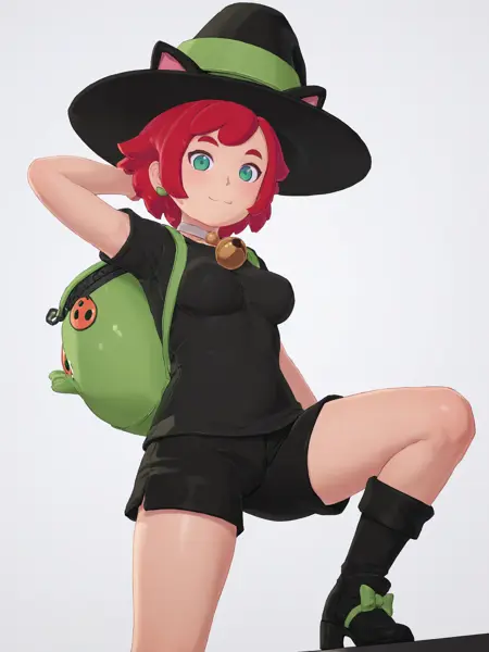 mika, 3d, witch hat, pink shirt, blue shorts, bracelet, white legwear, black shoes, backpack