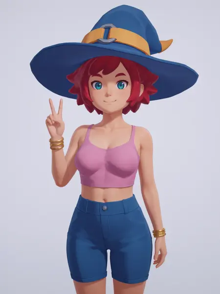 mika, 3d, witch hat, pink shirt, blue shorts, bracelet, white legwear, black shoes, backpack