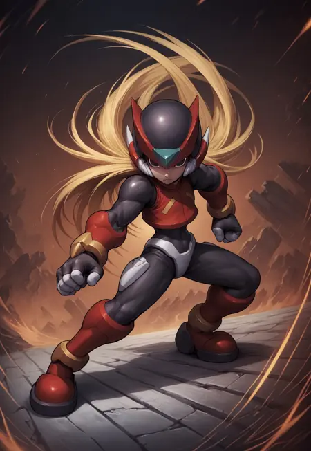 Pony tags: zerommz, score_9, source_anime, solo, full body, 1boy, helmet, blonde hair, long hair, crop top, black eyes, gauntlets, crotch plate, boots