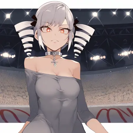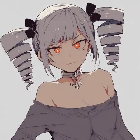 3. ((twin drills with bows, heavy steel collar with venus symbol pendant, off-shoulder long-sleeves black top, huge cleavage, obscene cleavage, white panties, dark grey thighhighs with frilled white edge, ))