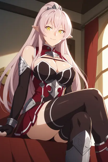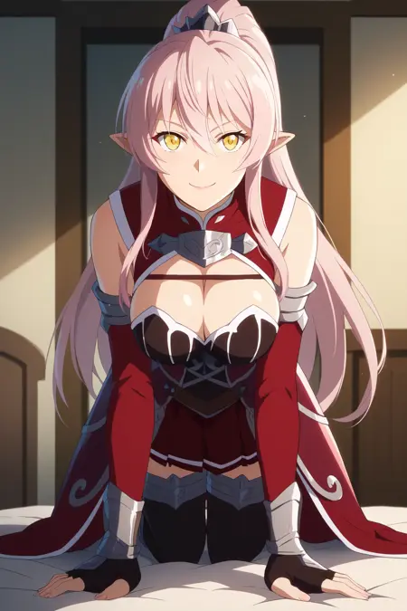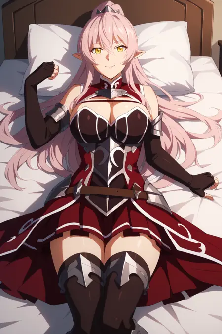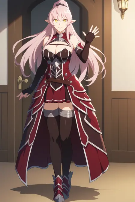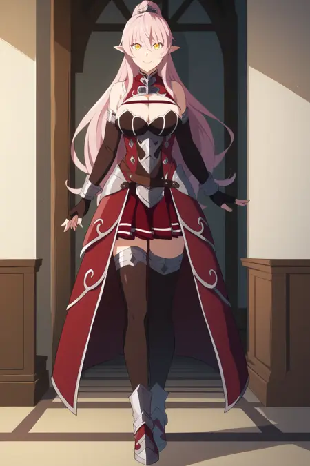 ➜ ArianeGlenysMapleSKAXL, yellow eyes, pink hair, long hair, high ponytail, hair between eyes, long sidelocks, pointy ears, large breasts, detached sleeves, red dress, brown corset, cleavage cutout, bridal guantlets, black elblow gloves, fingerless gloves, red skirt, pleated skirt, black thighhighs, red armored boots