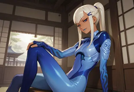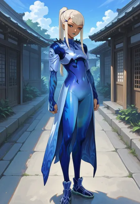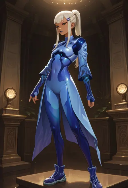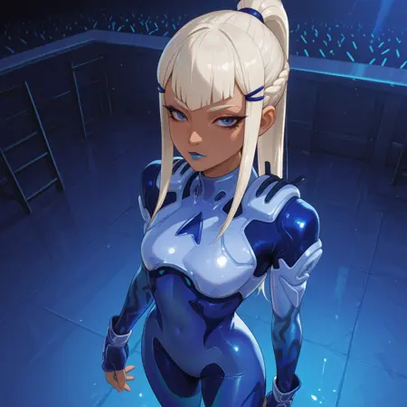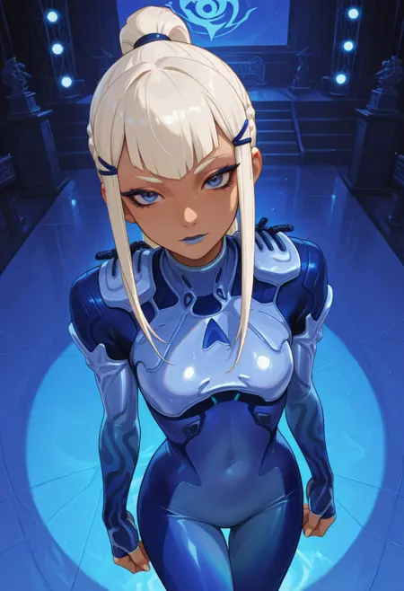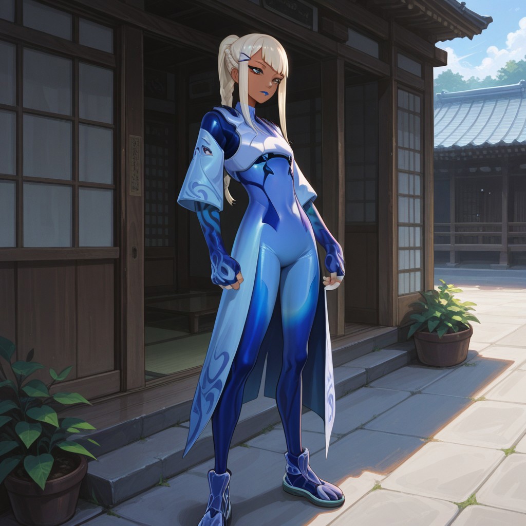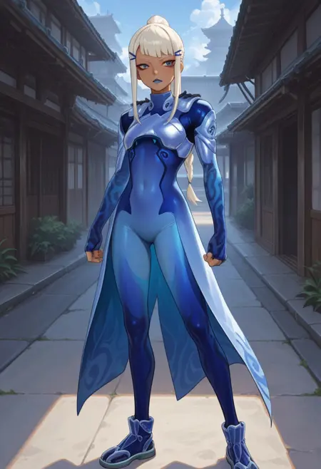 주요 태그: Mizuki_Fortnite, 1girl, solo, 흰 머리, 폰테일, 두 개의 땋은 머리, 메이크업, 파란 립스틱, 파란 옷, 타이트한 옷,