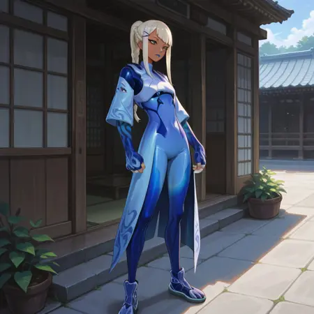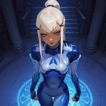 Main tags: Mizuki_Fortnite, 1girl, solo, white hair, ponytail, two braids, makeup, blue lipstick, blue outfit, tight outfit,