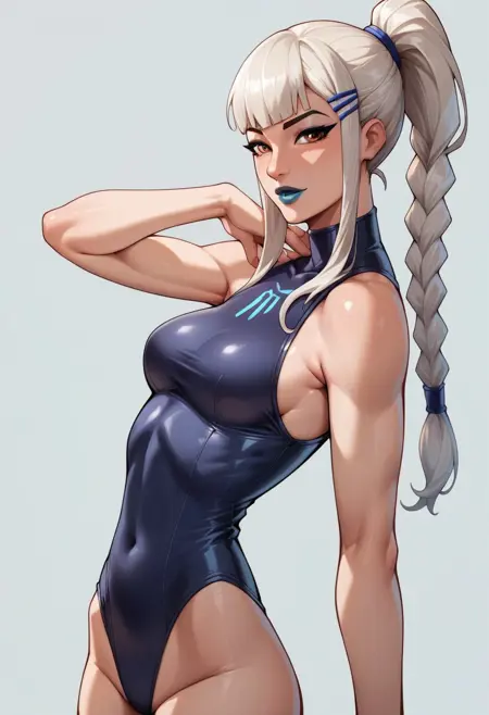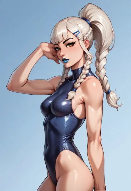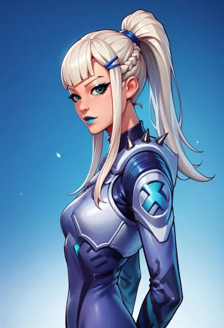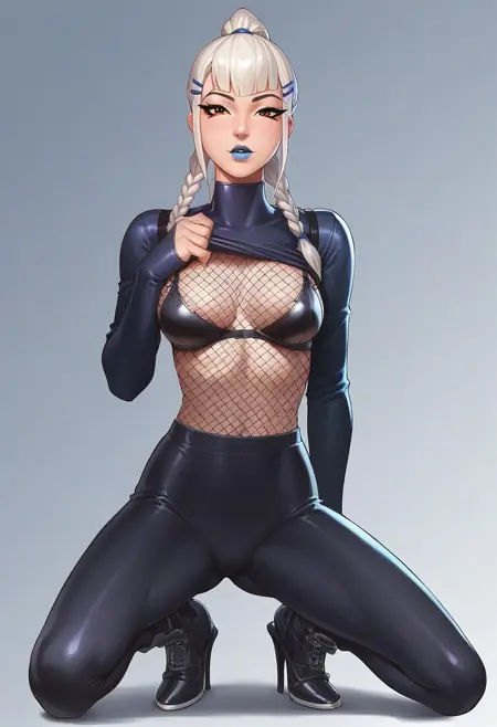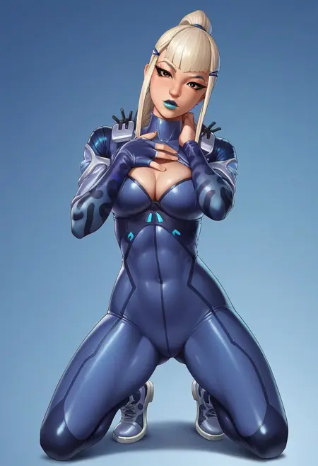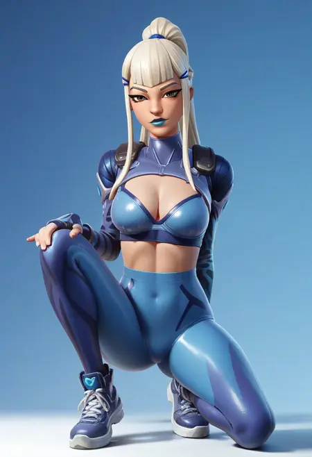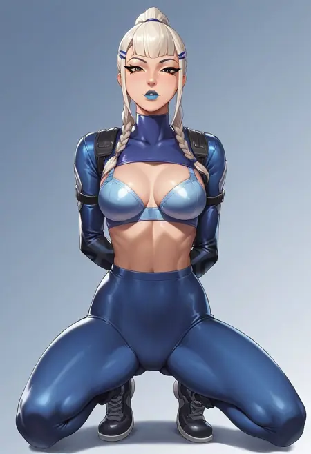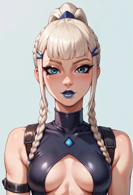 Main tags: Mizuki_Fortnite, 1girl, solo, white hair, ponytail, two braids, makeup, blue lipstick, blue outfit, tight outfit,