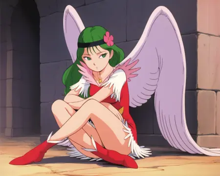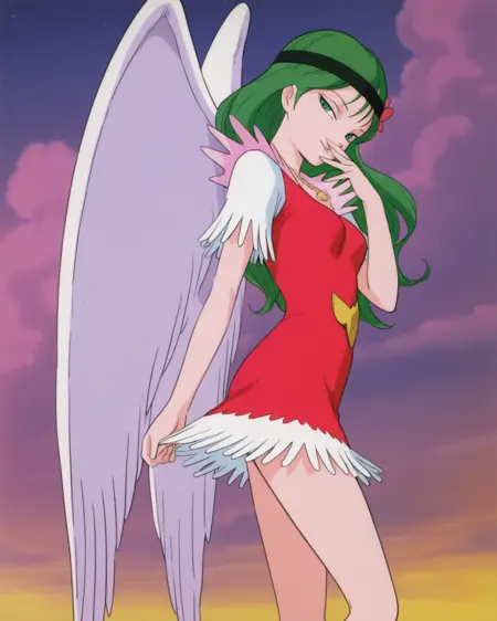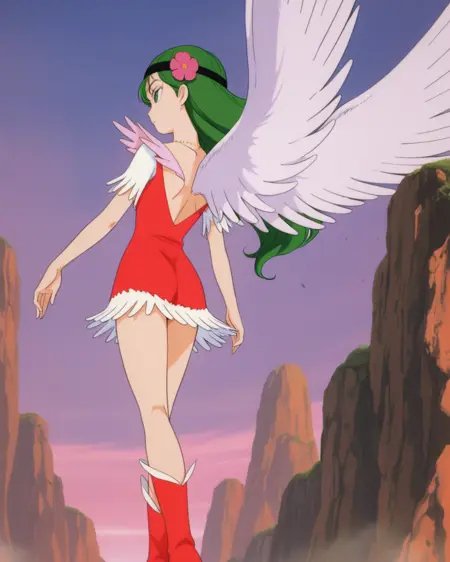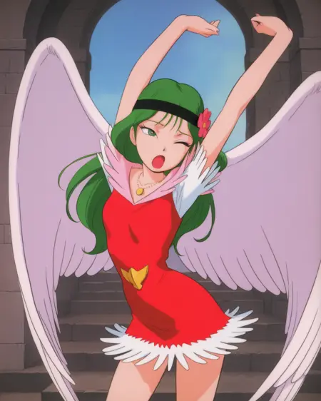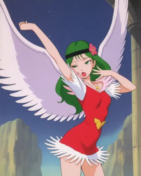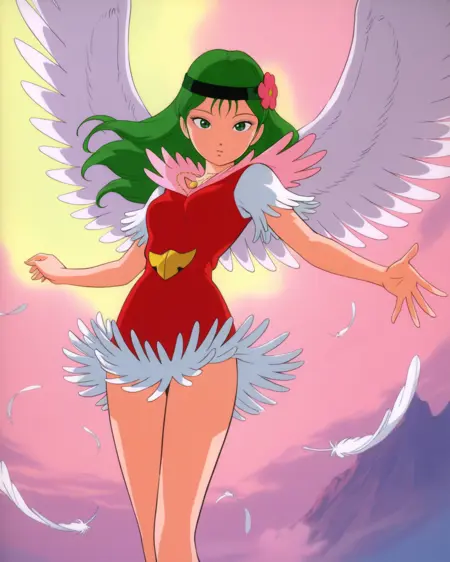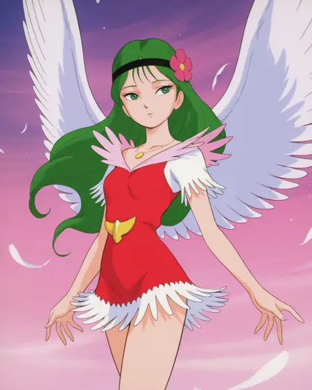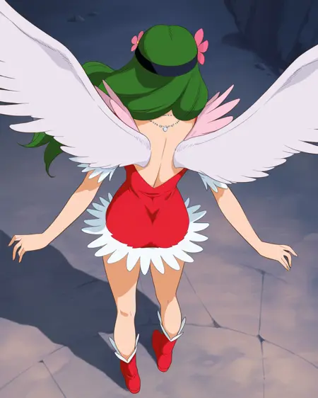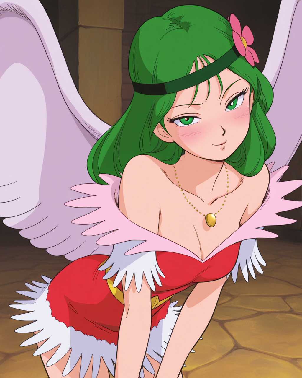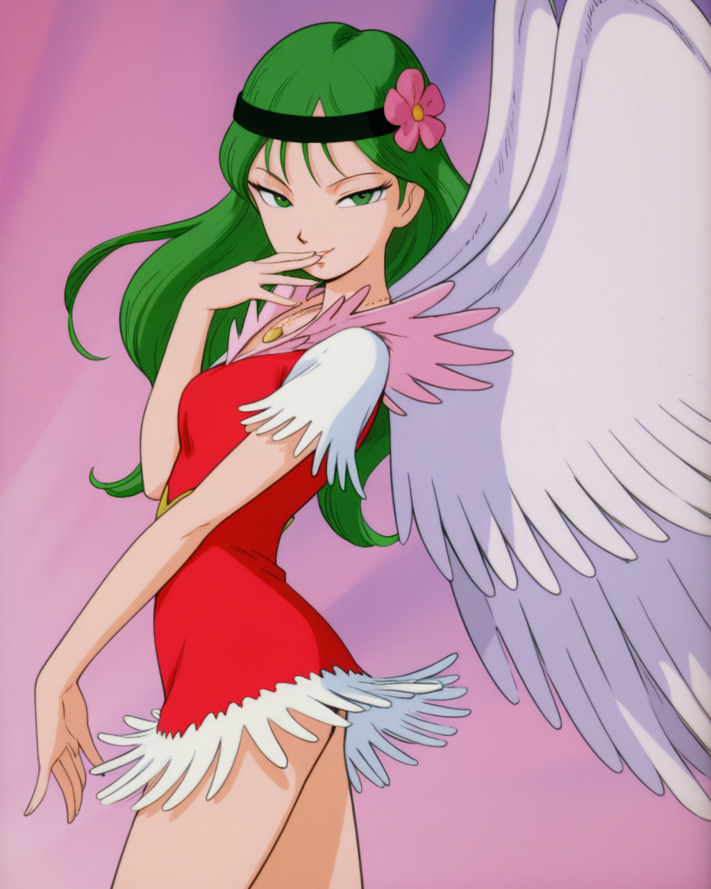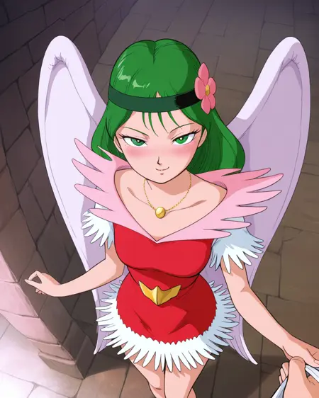 1girl, solo, Nazca, 緑の髪, 長い髪, 緑の目, 花のついたヘッドバンド, ピンクのカラーの赤いドレス, 白いフリンジの肩, 白いフリンジの裾, ネックレス, 金のエンブレム, 翼, 細い目