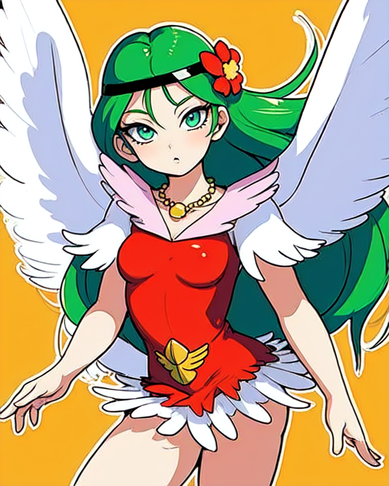 1girl, solo, Nazca, 绿发, 长发, 绿眼, 带花头带, 红色连衣裙配粉色领子, 白色流苏肩部, 白色流苏裙摆, 项链, 金色徽章, 翅膀, 狭长眼睛