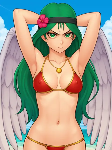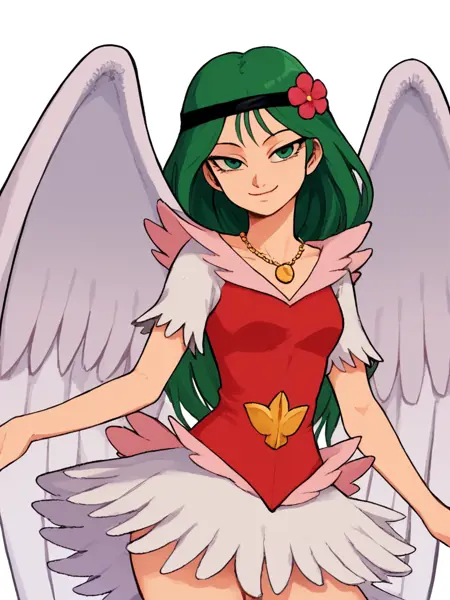 1girl, solo, Nazca, 绿发, 长发, 绿眼, 带花头带, 红色连衣裙配粉色领子, 白色流苏肩部, 白色流苏裙摆, 项链, 金色徽章, 翅膀, 狭长眼睛