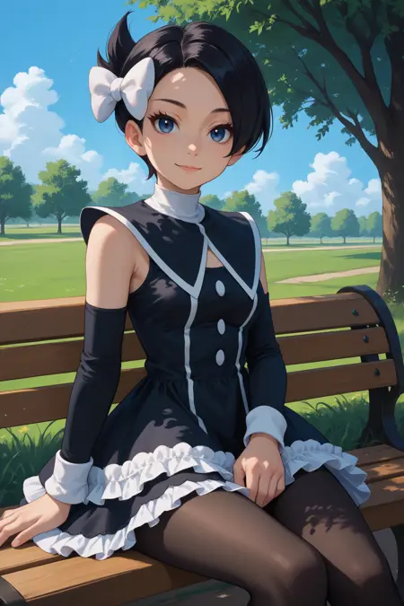 그녀의 전형적인 외모를 위해 "헤어 리본, 흰 리본, 검은 드레스, 의상 컷아웃, 프릴 드레스, 소매 없음, 분리된 소매, 검은 팬티스타킹, 검은 부츠"를 추가하세요.
