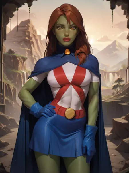 ヒーロー衣装:Megan、1girl、緑色の肌、茶色の髪、長い髪、茶色の目、唇、手袋、マント、青いスカート、ベルト、リップスティック、