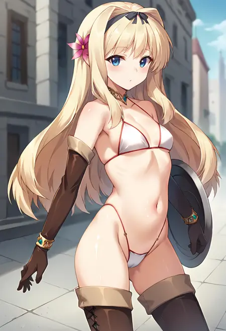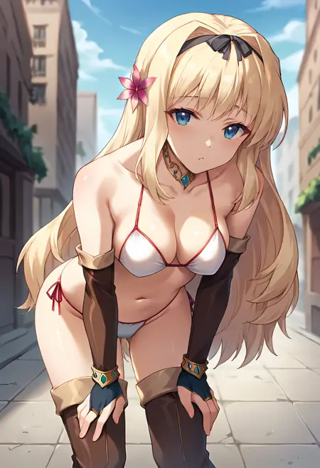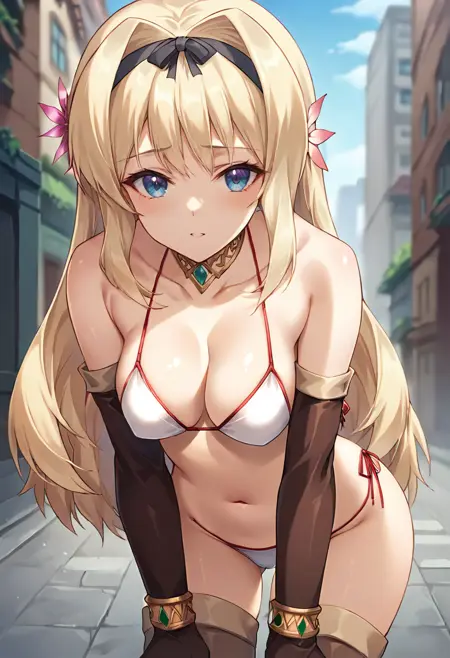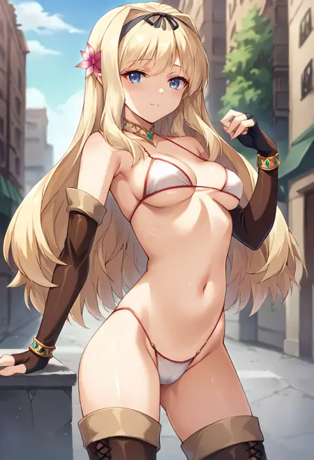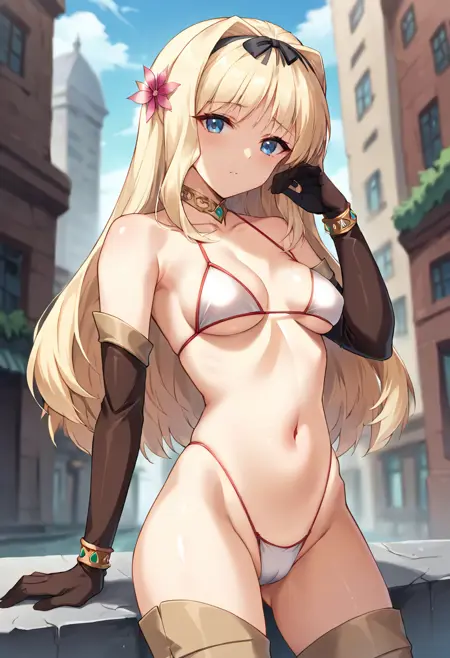 score_9, score_8_up, score_7_up, masterpiece, source_anime, 1girl, ct_sasa, long hair, medium breasts, blonde hair, black hairband, gold choker, hair flower, white bikini, elbow gloves, bracelet, brown thigh boots, outdoors, city, depth of field, looking at viewer, cowboy shot, shiny skin,