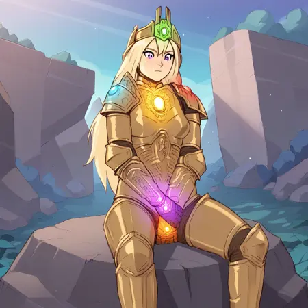infinitygauntlet, 1girl, solo, blonde hair, long hair, purple eyes, armor,