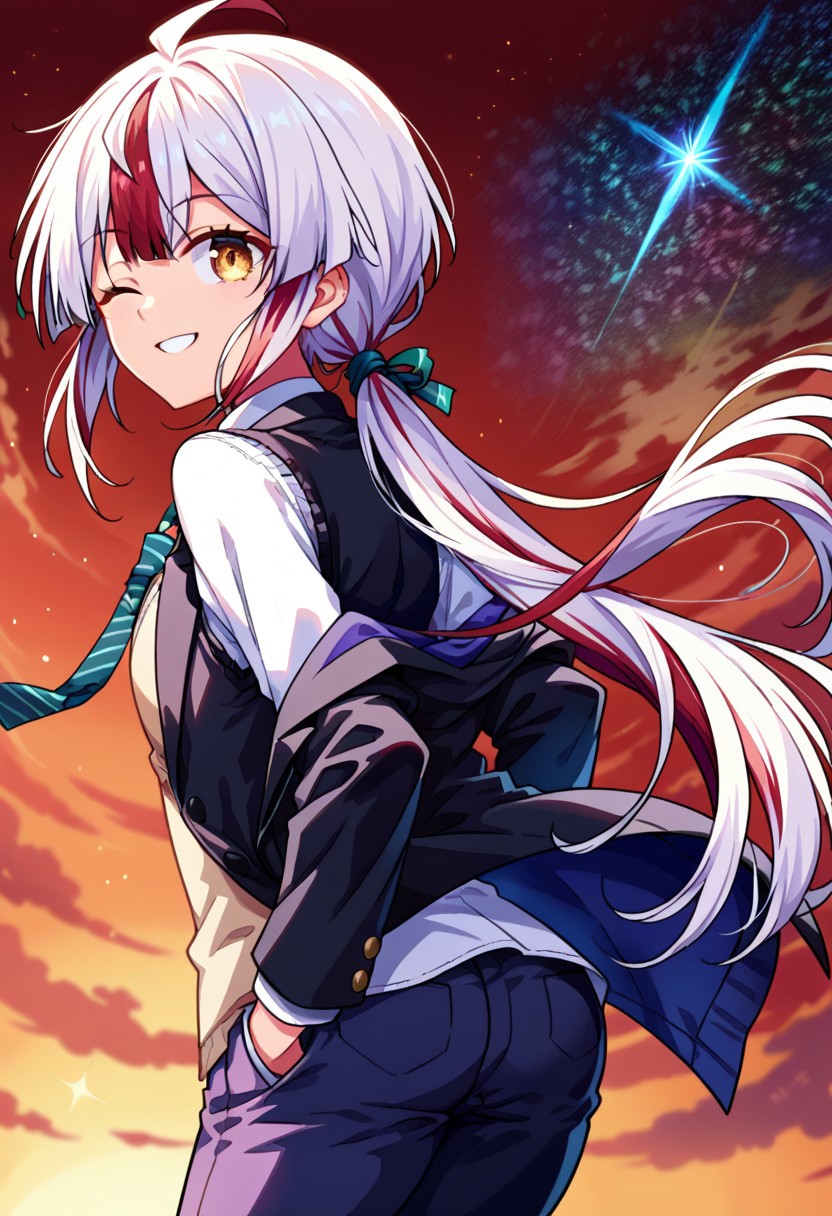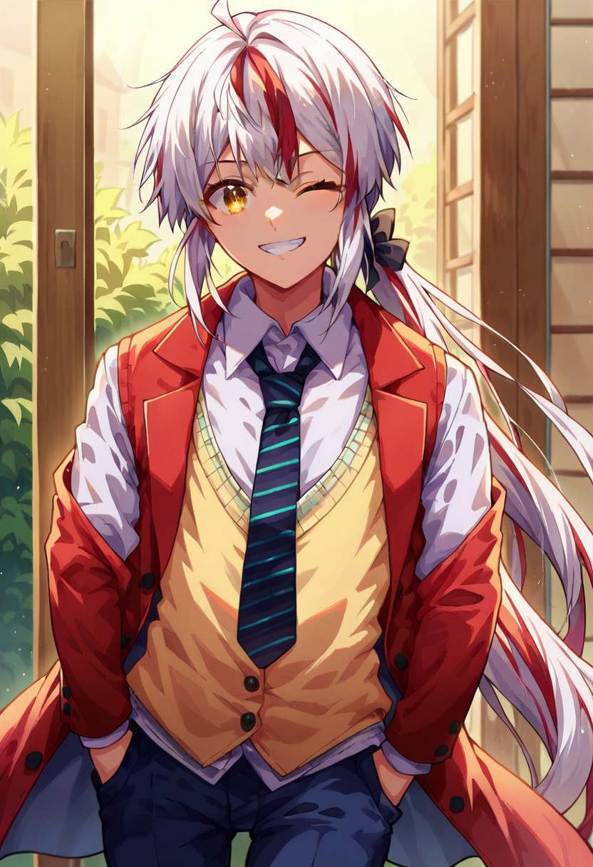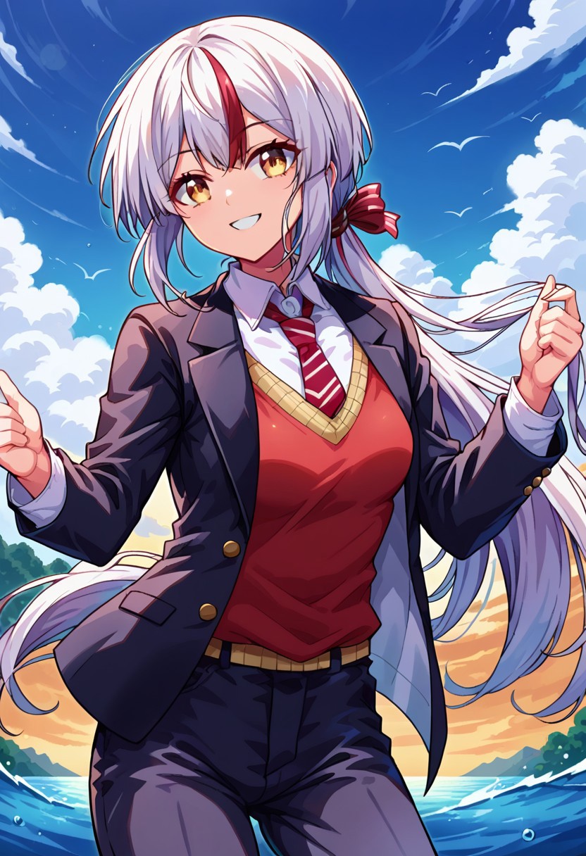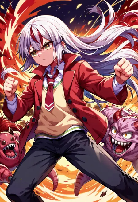 Ryuuga Hinomori, 1 girl, white hair, long red lock in front, alone, (golden eyes:1.2)