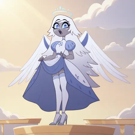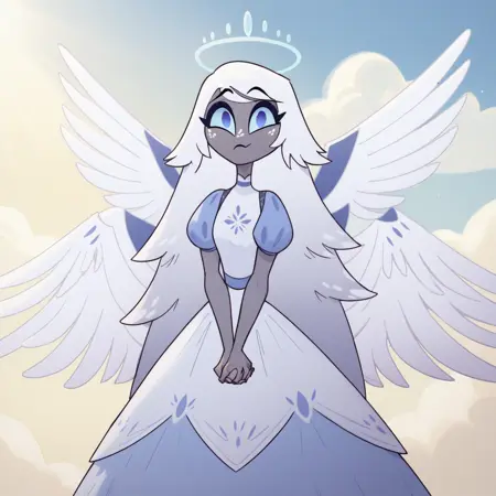 xemilyx, long hair, white hair, bangs, blue eyes, halo, colored skin, angel wings, multiple wings, freckles