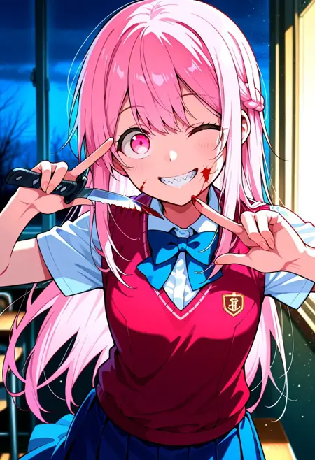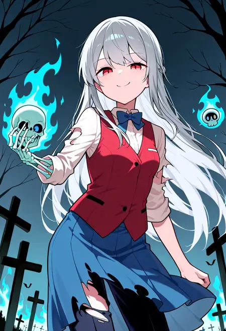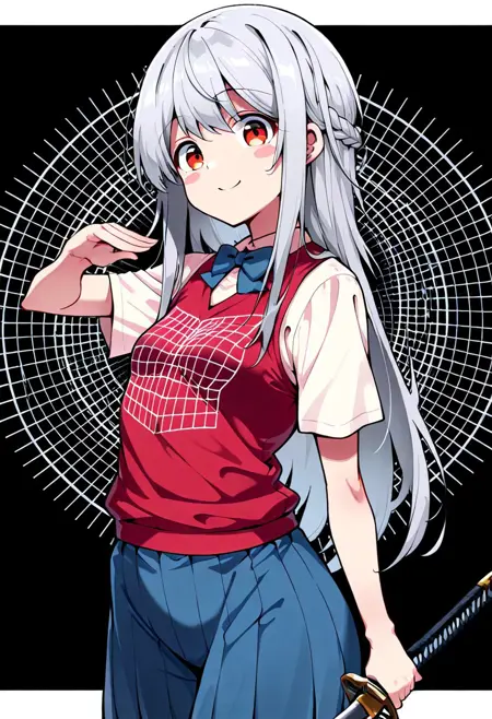 파란 치마, 트랙 스커트, 넥타이, 바지, 셔츠, 빨간 베스트, 크림색 셔츠, 미소, 파란 리본