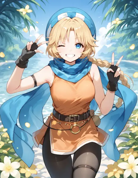 Add "hat,scarf,armband,fingerless gloves,orange dress,belt,belt pouch,pantyhose,thigh strap,boots" for her typical look.