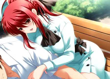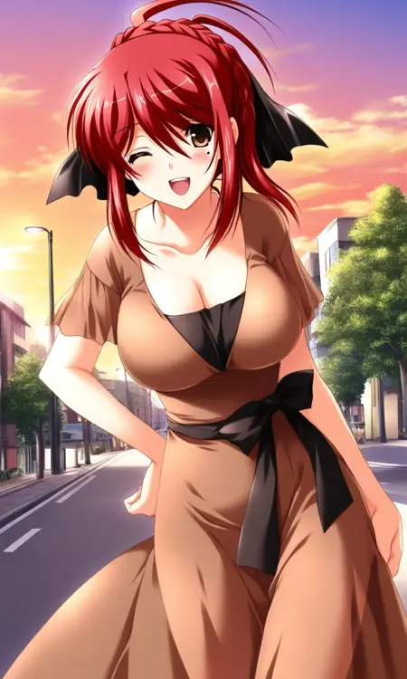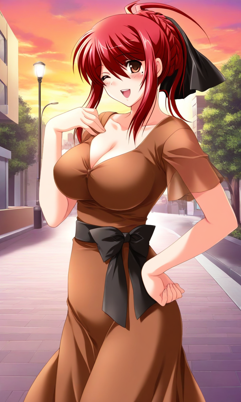 Saeki_Nozomi, 1girl, solo, red hair, large breasts, brown eyes, hair ribbon, braid,