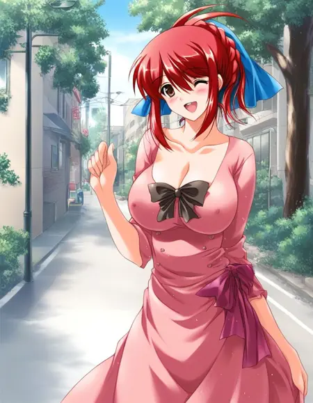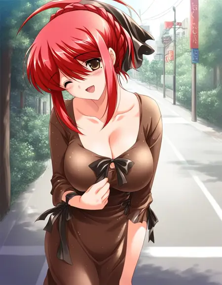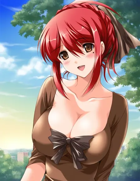 Saeki_Nozomi, 1girl, solo, red hair, large breasts, brown eyes, hair ribbon, braid,