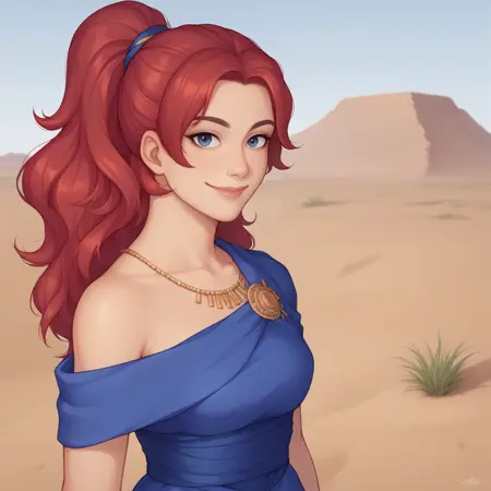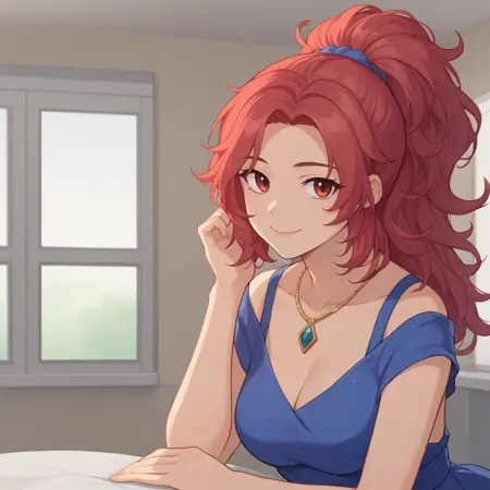옵션: 긴 빨간 머리, 토끼 꼬리, 보석, 파란 드레스
