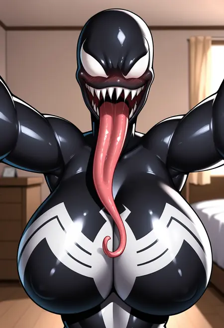 1girl, monster, breasts, large breasts, thick thighs, sharp teeth, teeth, tongue out, long tongue, bodysuit, claws, muscular