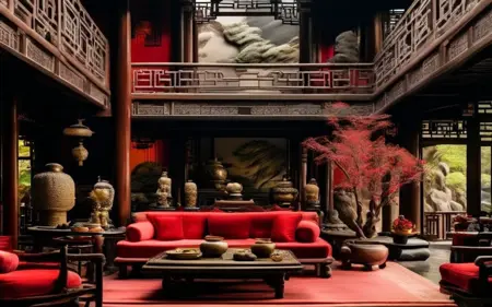 主要融合了传统中式元素和现代设计风格,色调以朱砂和黑檀色为主。