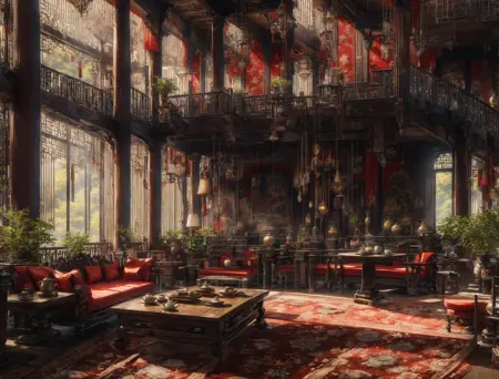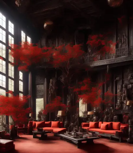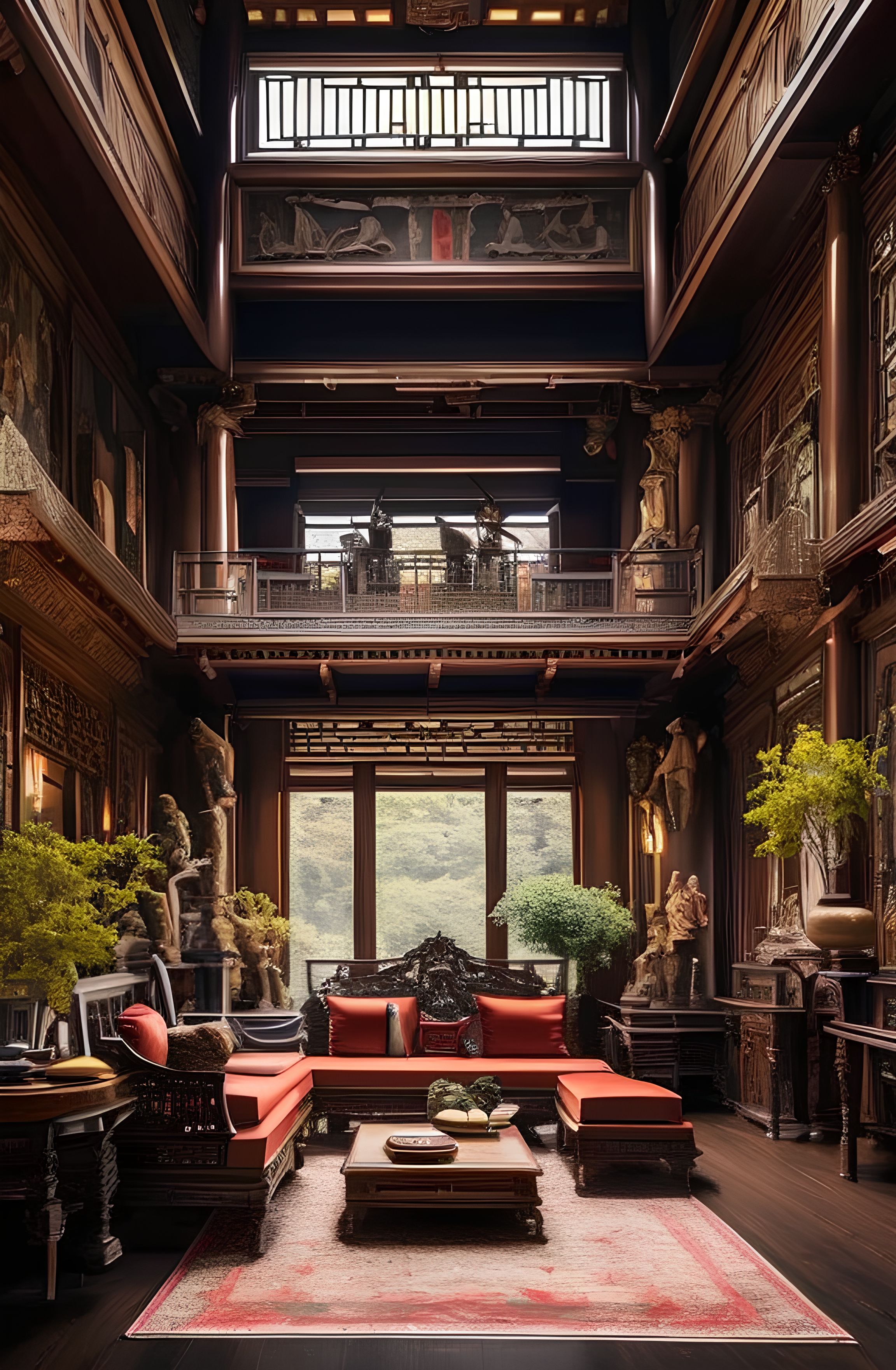 홍목 가구: 홍목 가구는 전통 중국 건축에서 흔히 볼 수 있는 요소로, 고귀함과 사치를 상징한다.