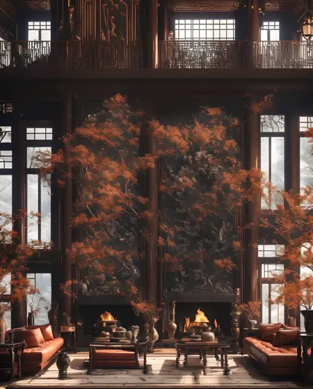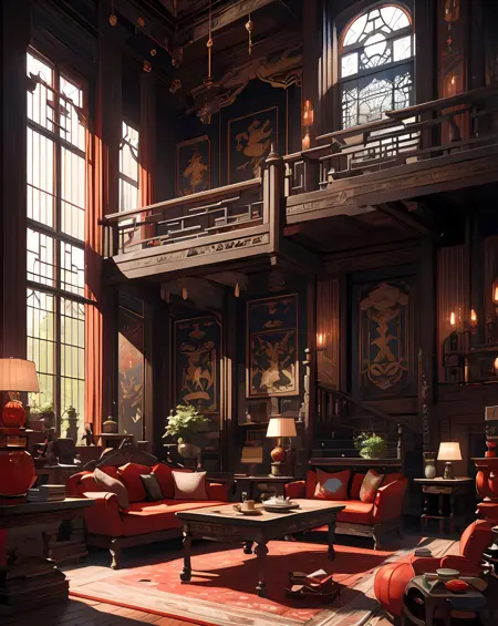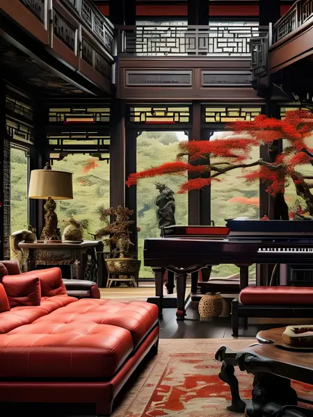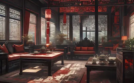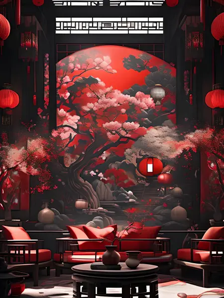 The main fusion of traditional Chinese elements and modern design styles, the colour palette is dominated by vermillion and ebony.