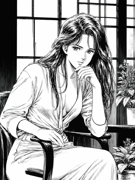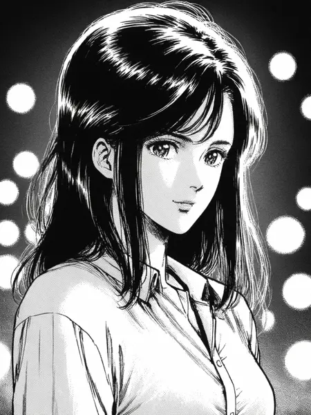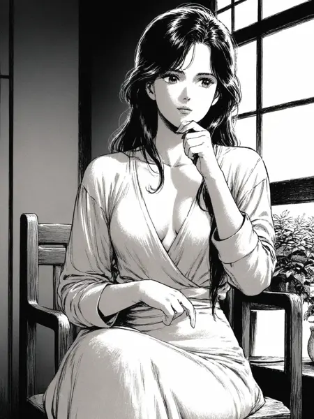 - 추천 키워드: Hoko, 1girl, solo, retro manga style, detailed line art, high contrast shading, simple background