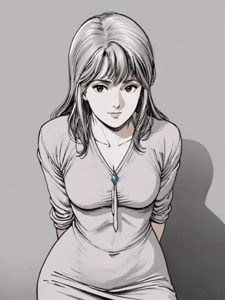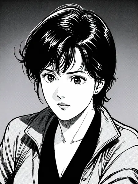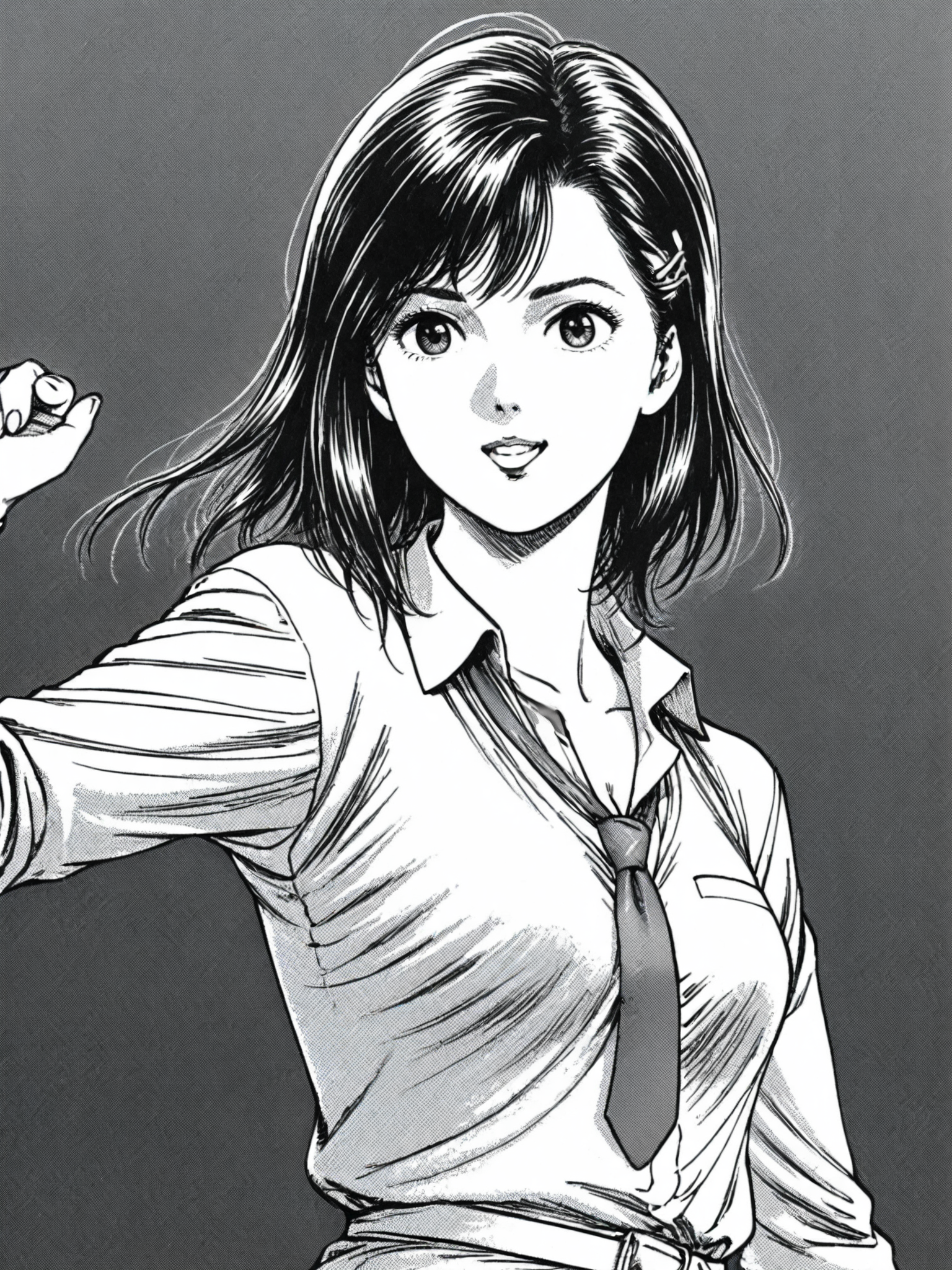 推荐关键词:Hoko, 1girl, solo, retro manga style, detailed line art, high contrast shading, simple background