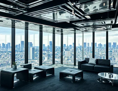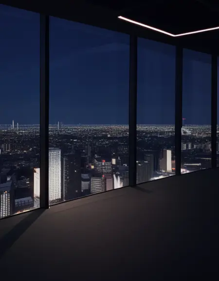 室内观景,黑色地板,窗户,来自SKY GALLERY的城市景观