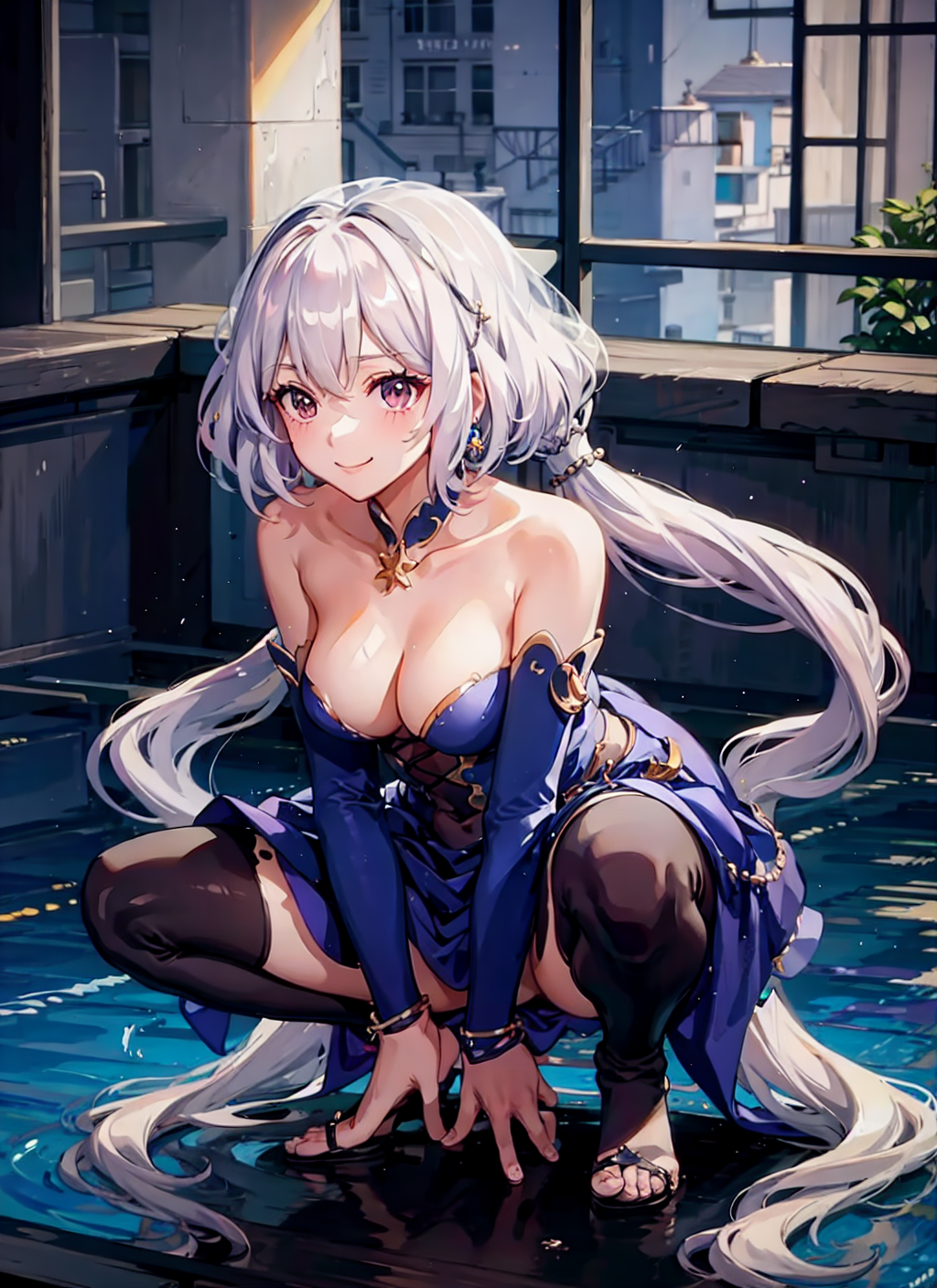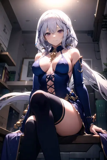 의상2: 드레스, 무릎까지 오는 양말, 검은 장갑, 보석, 귀걸이, 배꼽 파트, 엉덩이가 허벅지 사이로 드러남, 볼륨감 있는 가슴라인, 옷의 파츠가 벗겨진 부분, 소매 없이 파란 드레스, 벗어난 어깨