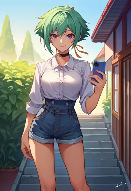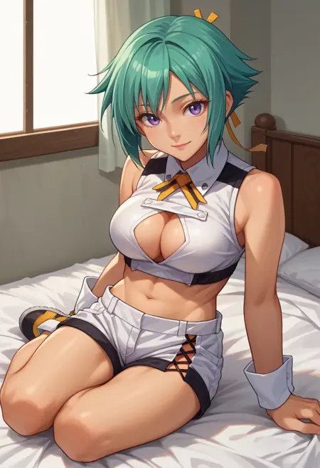 ZessicaWong, short hair, hair ribbon, yellow bowtie, white shirt, collared shirt, crop top, cleavage cutout, sleeveless, wrist cuffs, white shorts, short shorts, cross-laced slit