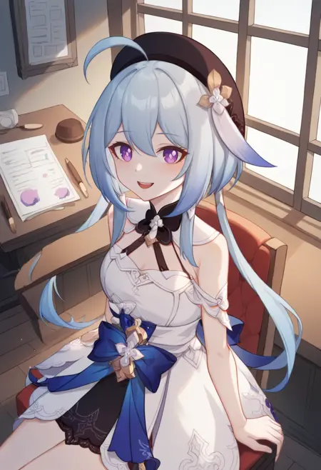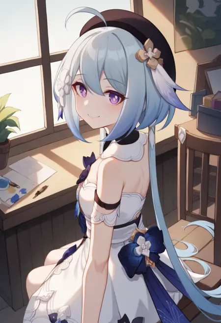 dress,white dress,beret,hat,looking at viewer,bare shoulders,black headwear,hair ornament,sleeveless dress,ankle socks,
