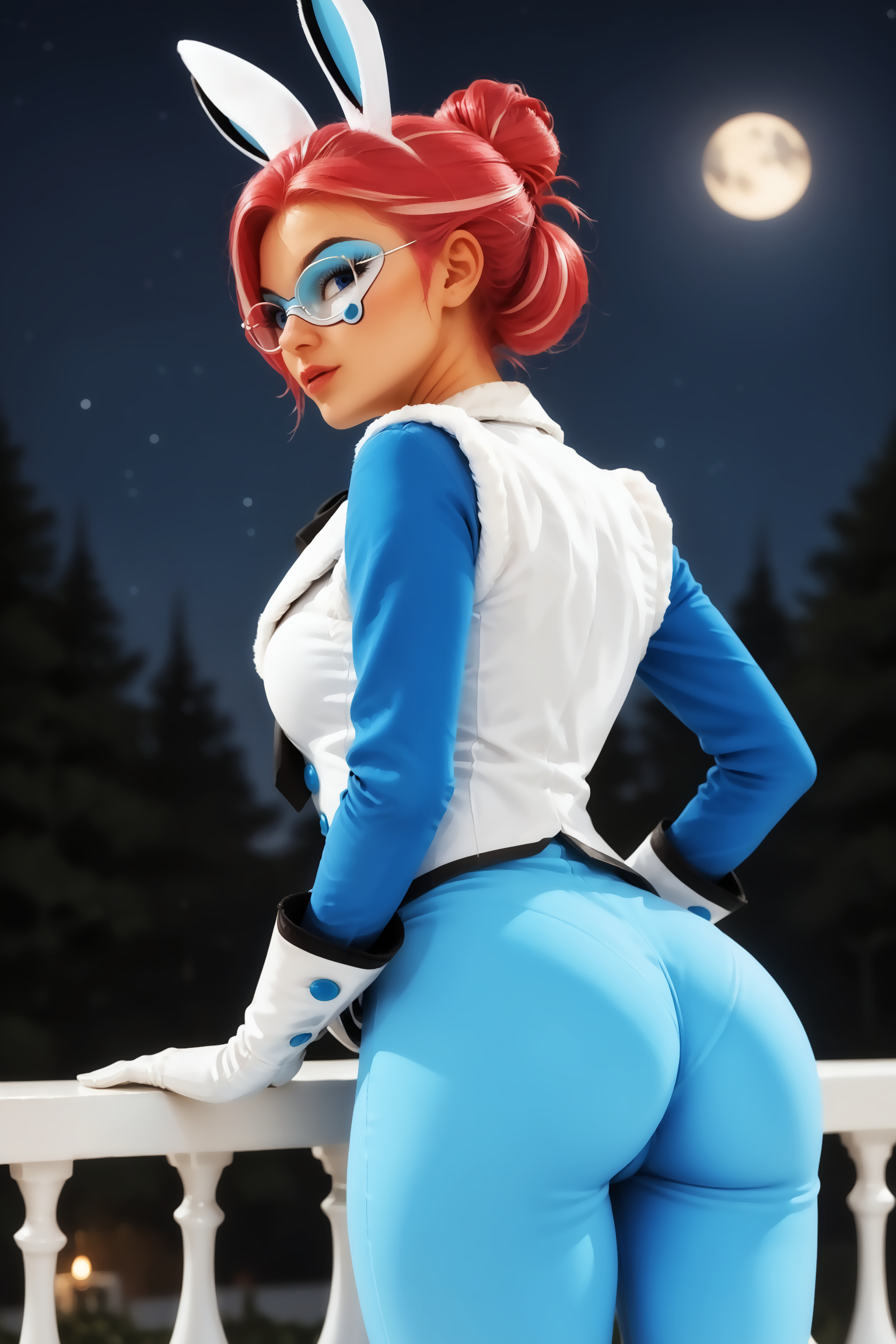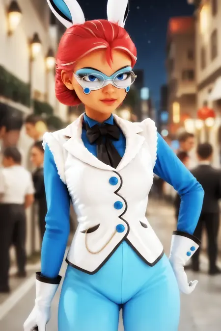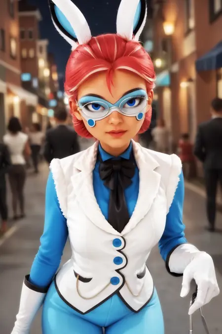 Bunnyx 프롬프트: 1girl, 단발, 바디수트, 빨간 머리, 분홍 머리, 마스크, 파란 눈, 도미노 마스크, 동물 귀, 토끼 귀, 흰 장갑, 팔꿈치 장갑, 슬림핏
