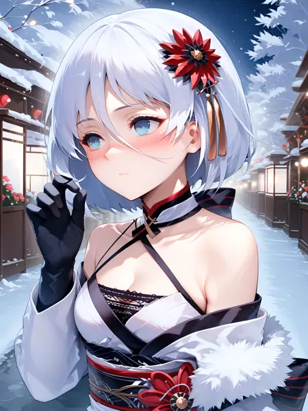 松之节句、白之冰华(seasonal_pine_and_the_frost_flower): tirpitz \(azur lane\), 白发, 短发, 白色和服, 头发上的花饰, 黑色手套, 腰带, 交叉吊带, 蕾丝,