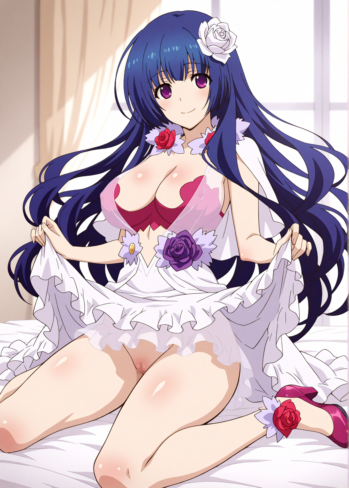 flower collar,white dress, purple rose, purplish red bra,see-through inner skirt