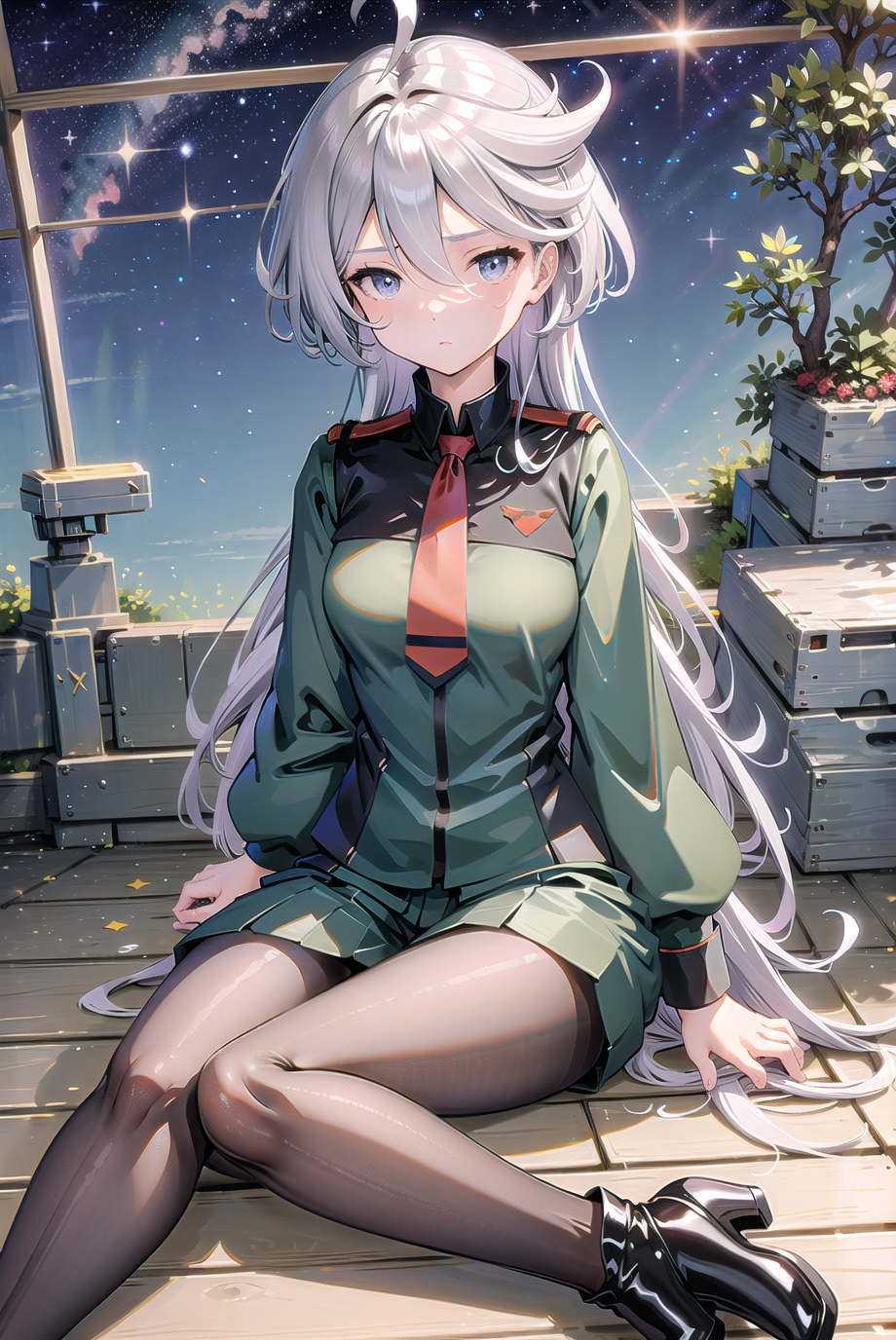 提示:miorine, asticassiaSoT default uniform, 1girl, ahoge, bangs, black footwear, black legwear, black shirt, grey eyes, hair between eyes, long hair, long sleeves, looking at viewer, necktie, pantyhose, parted lips, water, water behind her, shirt, shoes, sitting, shorts, sitting on stone, stone in water, solo, very long hair, white flower, lora:Miorine-000009:0.6, close up, legs apart,