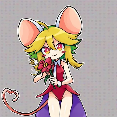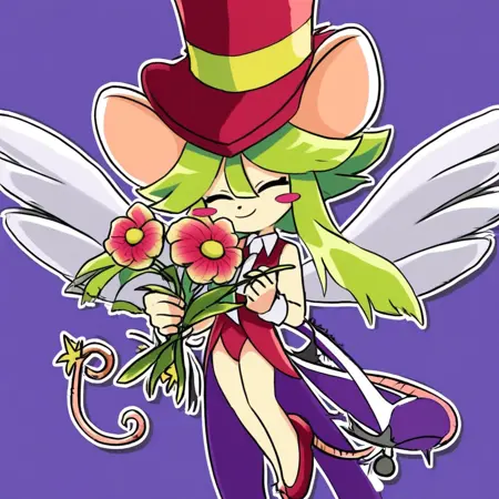 1girl, green hair, mouse ears, mouse tail, tophat, wings, blush stickers, red eyes, leotard