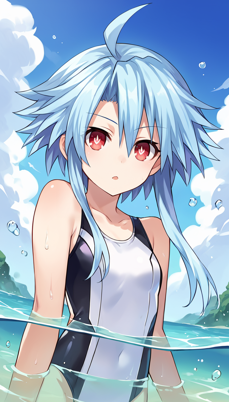 외모: 흰 하트 \(neptunia)\, 연한 파란 머리카락, 붉은 눈, 아호게, 파워 심볼, 긴 머리카락이 있는 짧은 머리, 심볼 모양의 동공, 흰 동공, 작은 가슴