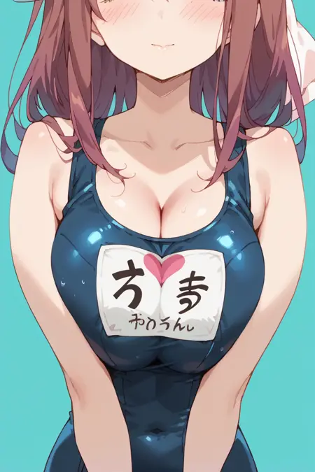 haruka, 1girl, solo, hair ribbon, one-piece swimsuit, breasts, name tag,
