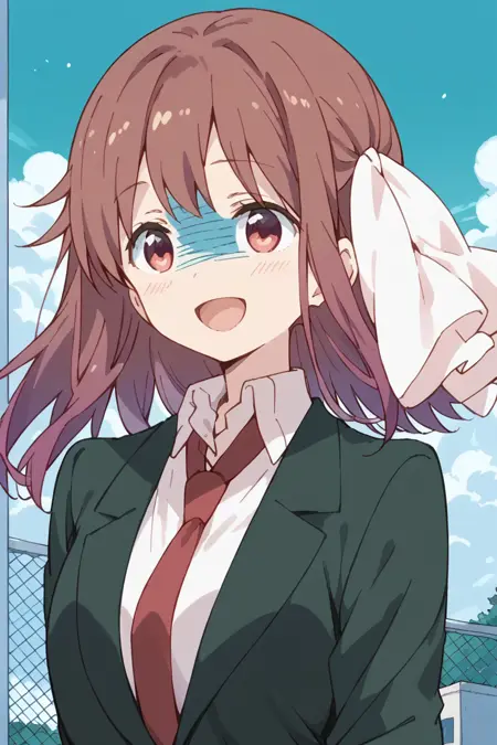haruka, 1girl, solo, hair ribbon, necktie, school uniform, blazer/shirt, long sleeves/short sleeves