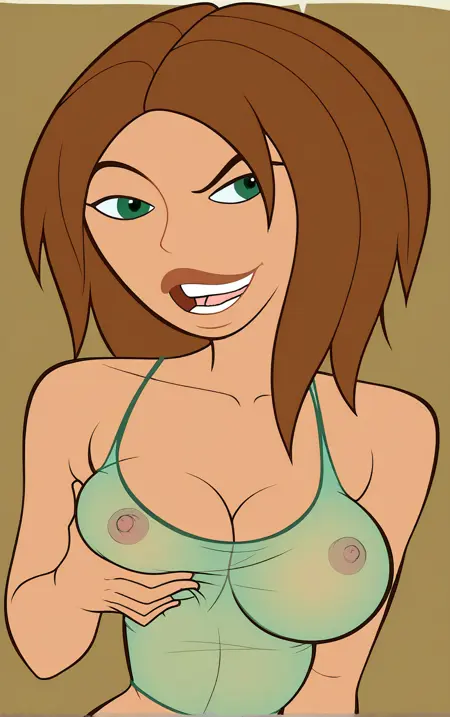 1girl, brown hair, cleavage, colored skin, dark skin, dark-skinned female, green eyes, green tank top, large breasts, lips, medium hair, covered nipples, see-through, tank top