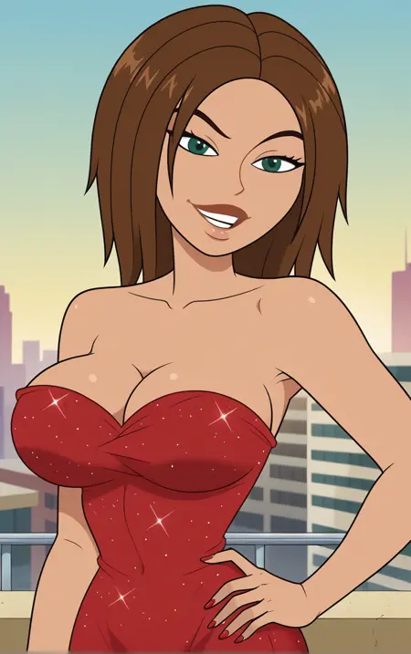 1girl, red dress, short dress, side slit, sparkle print, strapless dress,  cleavage, bare shoulders, colored skin, dark-skinned female, green eyes, lips, medium hair, brown hair, dark skin, large breasts, makeup, lipstick, strapless, collarbone,